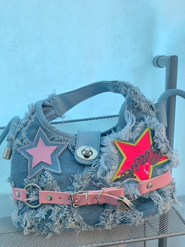 Denim Raw Edge Star Buckled Crossbody Bag