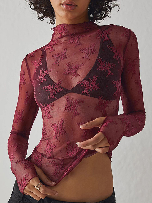 Solid See Through Lace Mock Neck Long Sleeve Tee