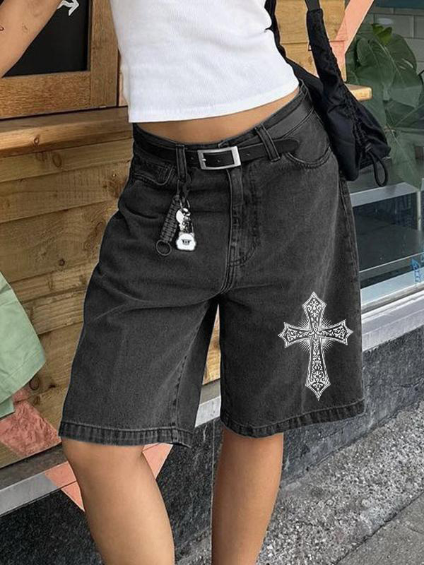Cross Print High Waist Straight Leg Denim Shorts