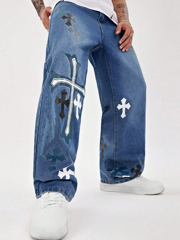 Men’s Clashing Cross Print Loose Jeans