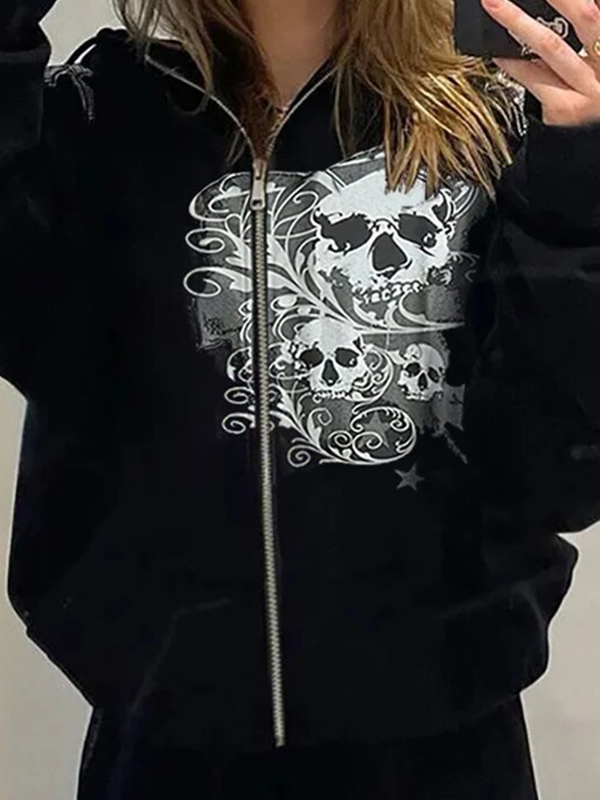 Halloween Skull Print Zip Up Drawstring Oversized Hoodie