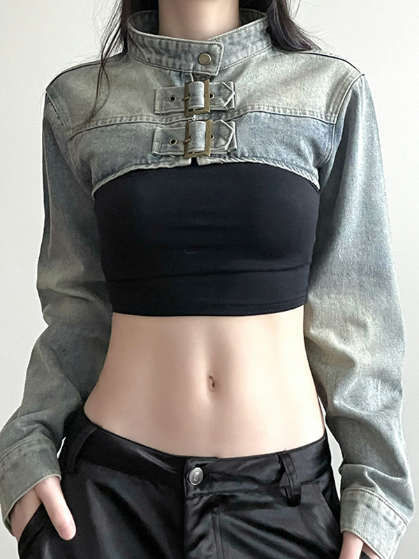 Light Washed Collar Neck Buckle Ultra Short Jacket