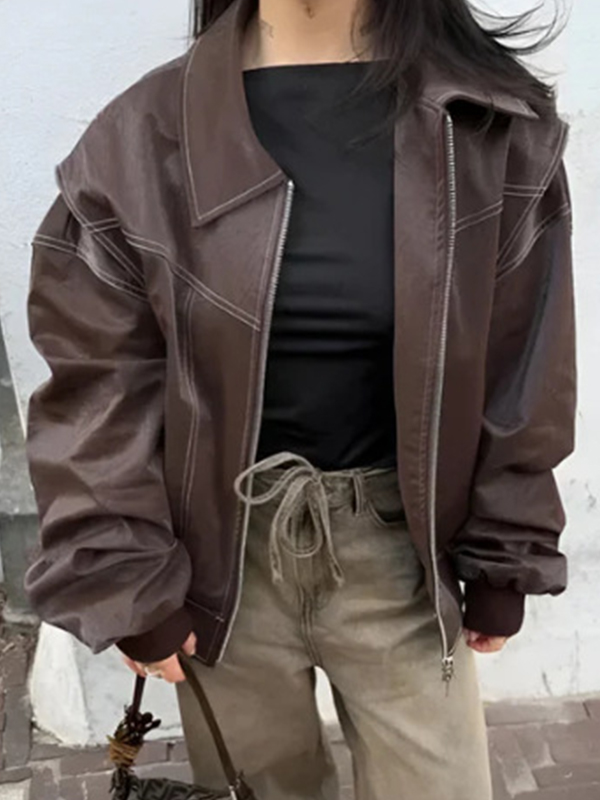 Loose long sleeve vintage leather jacket