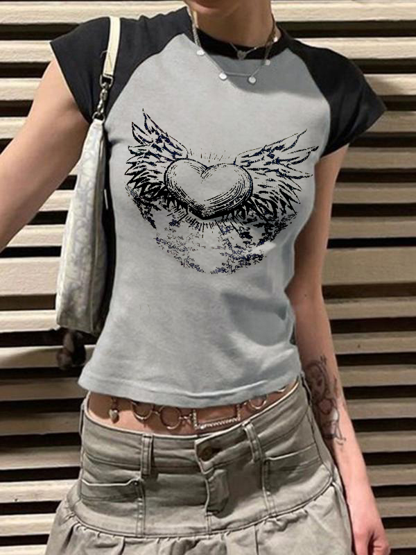 Y2K Wings Print Contrast Raglan Slim Short Sleeve Tee