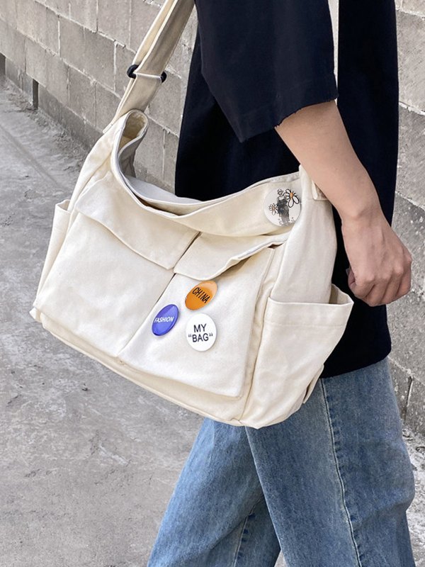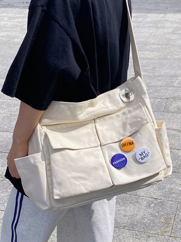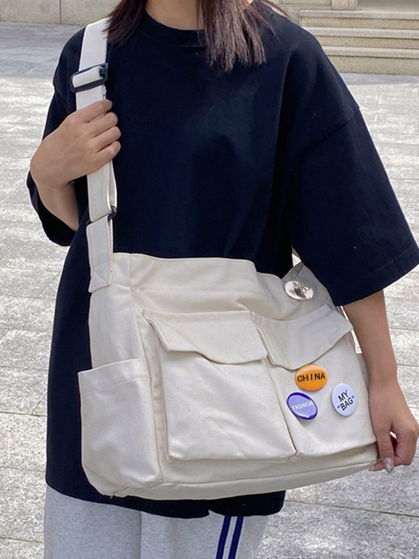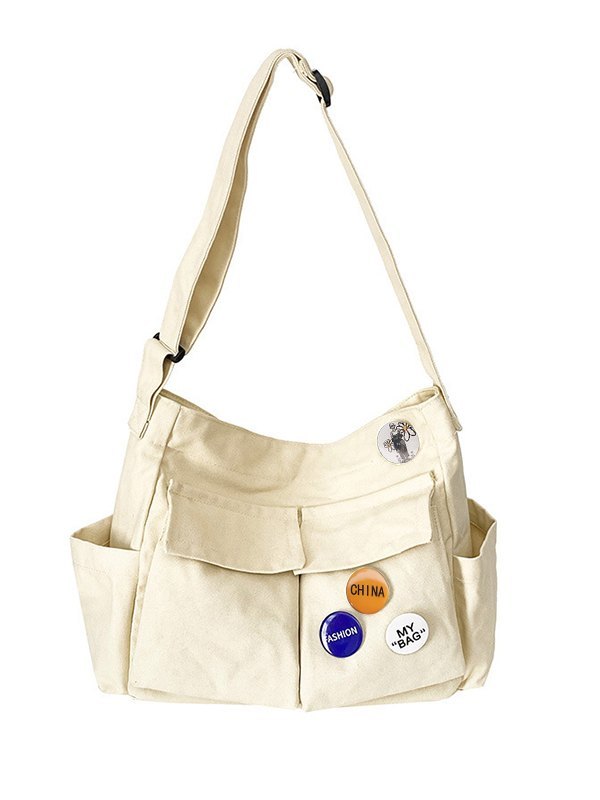 Details: Features an adjustable shoulder strap, with multi badge pendants, inner pockets and zip fly design.