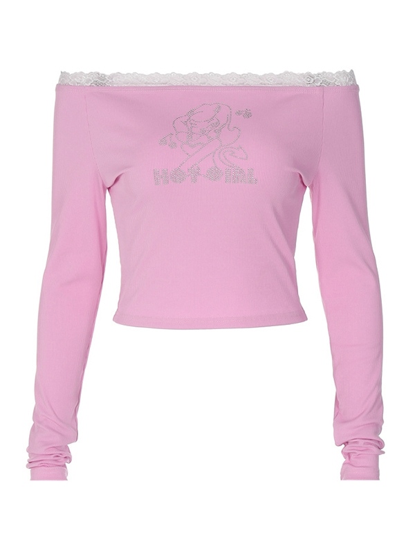 Cartoon Rhinestone Print Off Shoulder Lace Trim Long Sleeve Tee