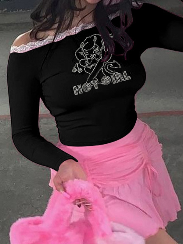 Cartoon Rhinestone Print Off Shoulder Lace Trim Long Sleeve Tee