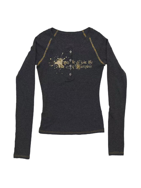 Vintage Print V Neck Breasted Long Sleeve Tee